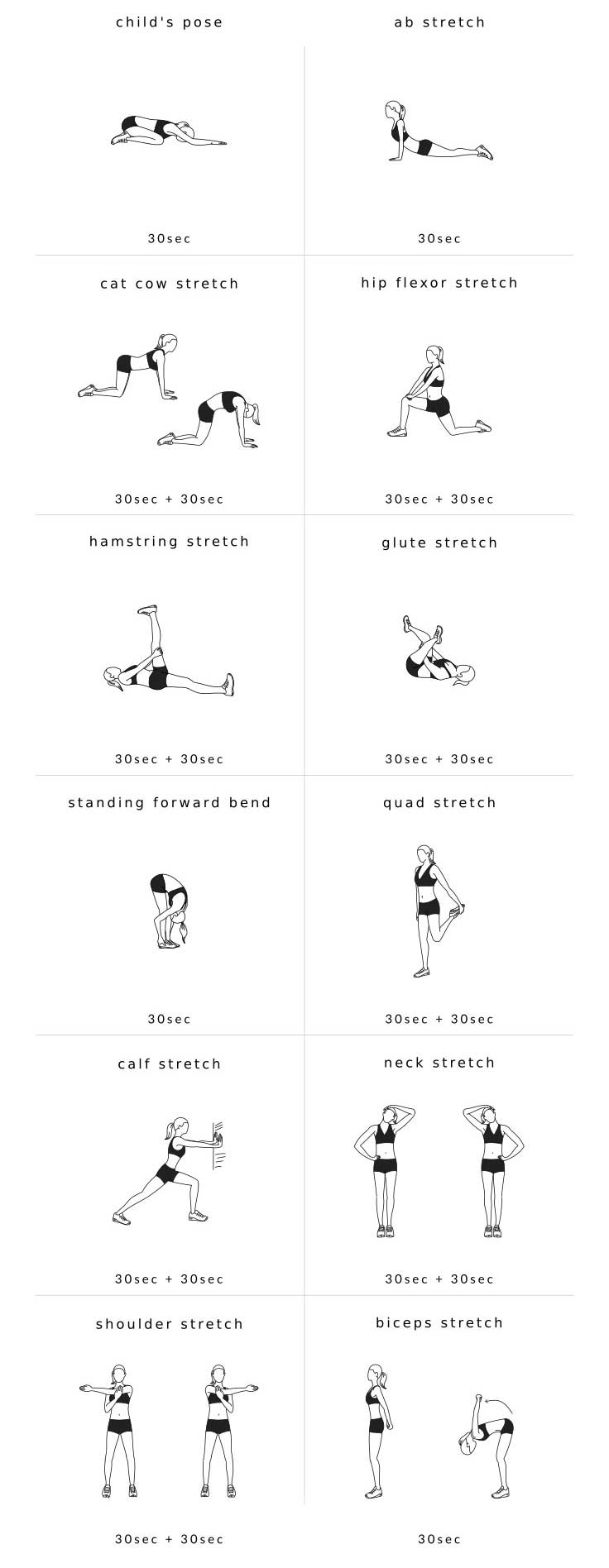 ابتدا ورزش را با حرکات گرمکننده و پویای کل بدن، شروع نموده و سپس، به مدت ۳۰ دقیقه، ورزش هوازی انجام بدهید و بعد، با انجام حرکات منعطفکننده زیر، به ورزش خاتمه بدهید.