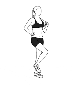 ۶۰ ثانیه. پا را از پشت بالا بیاورید تا پاشنه پا به پشت ران و باسن بخورد. در همین حین، دستها را هم پمپ کرده و به بالا و پایین تکان بدهید.