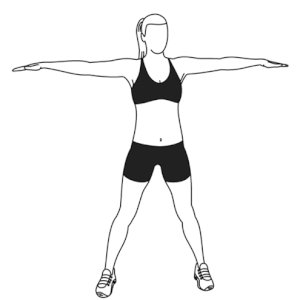 ۶۰ ثانیه. بالا بپرید و پاها را از هم دور کرده و دستها را در بالای سر دراز نموده و به هم بزنید. دوباره بپرید و به موقعیت اولیه برگردید.
