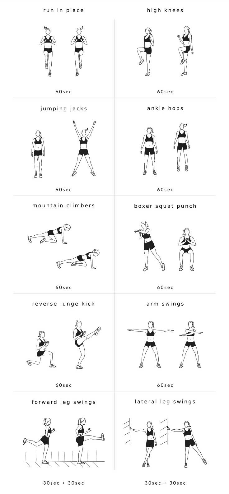 ۶۰ ثانیه. گرم کردن خود را با درجا دویدن شروع کنید تا ضربان قلب شما بالا برود.