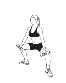 ۱) بایستید و پاها را با فاصله زیاد از هم قرار بدهید. انگشتان پا به سمت خارج و طرفین باشند. با هر دست خود یک دمبل را نگه دارید. کف دستها رو به بالا باشند.