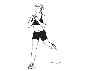 ۲) پای راست خود را بر روی پله گذاشته و زانوهای خود را خم کنید و کپلها را تا وقتی که ران چپ شما به موازات زمین قرار بگیرد، پایین بیاورید.