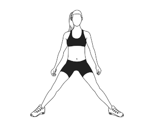 ۱) بایستید و پاها را با فاصله زیاد از هم قرار بدهید. انگشتان پاها رو به طرفین باشند.