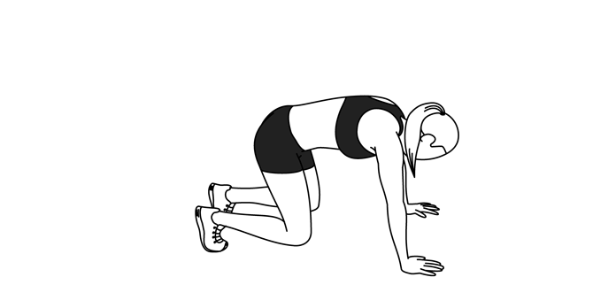 ۱) بر روی دستها و زانوهای خود، روی زمین قرار بگیرید. مچ دستها باید در زیر شانهها باشند و زانوها به اندازه عرض کپل از هم فاصله داشته باشند.