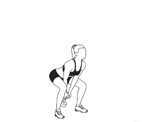 ۲) اسکوآت را انجام داده و دمبل را به بین پاهای خود بیاورید.