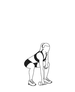 ۱) با دست راست خود، یک دمبل را نگه دارید. زانوها را خم کرده و کپلها را به عقب بکشید و دمبل را به بین پاهای خود ببرید.