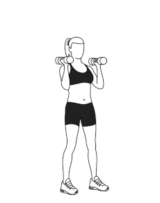 ۱) بایستید و پاها را به اندازه عرض شانه از هم باز کنید. دمبلهار را در جلوی شانه خود نگه دارید.