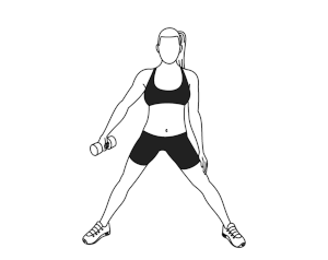 ۱) بایستید و پاها را کمی بیشتر از عرض شانه از هم باز کنید. انگشتان پاها کمی به سمت بیرون باشند. دمبل یا کتبلبل را در دست راست خود نگه دارید.