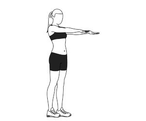 ۱) صاف بایستید و پاها را به اندازه عرض کپل از هم باز کنید. دستها را در جلوی بدن، دراز کنید.