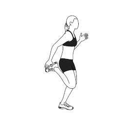 ۲) با پاهای خود طوری از پشت با بالا لگد بزنید که پاشنه پاهای شما با عضلات باسن تماس پیدا کنند. همزمان، دستهای خود را نیز به بالا و پایین پمپ کنید و حرکت بدهید.