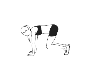 ۱) بر روی دستها و زانوهای خود، روی زمین قرار بگیرید و زانوهای خود را به اندازه چند سانتیمتر از زمین بلند کنید.