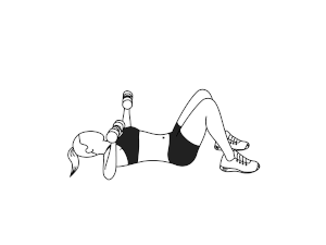 ۲) عضلات شکم را منقبض کرده و شانهها را از زمین بلند کنید و با دست راست خود، یک مشت به بالا بزنید.