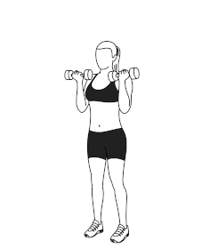 صورت، رو به جلو باشد و کمر را صاف نگه دارید. سینه را به جلو بدهید و وقتی که دمبلها را به بالا میبرید و کف دستها را میچرخانید، عمل بازدم را انجام بدهید. برای پشتیبانی کمر خود، عضلات هسته را نیز درگیر کنید. دستها باید به اندازه عرض شانه از هم جدا باشند و آرنجها را در زیر مچ دستها نگه دارید.