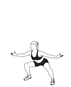 ۲) به بالا بپرید و پاها را از هم باز کنید. زانوها را خم کرده و کپلها را به عقب ببرید و دستها را نیز از هم باز کنید.