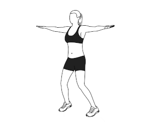 ۹) تاب دادن دستها: ۳۰ ثانیه. بایستید، زانوها را کمی خم کرده و پاها را به اندازه عرض شانه باز کنید. دستها را به موازات زمین به طرفین بدن دراز کنید. سپس، دستها را در جلوی بدن به صورت متقاطع در آورده و بعد به سرعت، تا جایی که میتوانید به سمت عقب بدن بکشید.