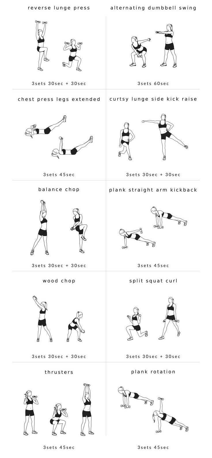 ۳)پرس سینه همراه با بلند کردن پاها: ۴۵ ثانیه. به روی کمر دراز بکشید و در هر دست خود، یک دمبل بگیرید. پاها را با زاویه ۴۵ درجه از زمین بلند کنید. دمبلها را به بالا و سمت سقف ببرید. کف دستها باید به سمت پاها باشند و بازوها، مستقیماً در بالای شانهها قرار گرفته باشند.