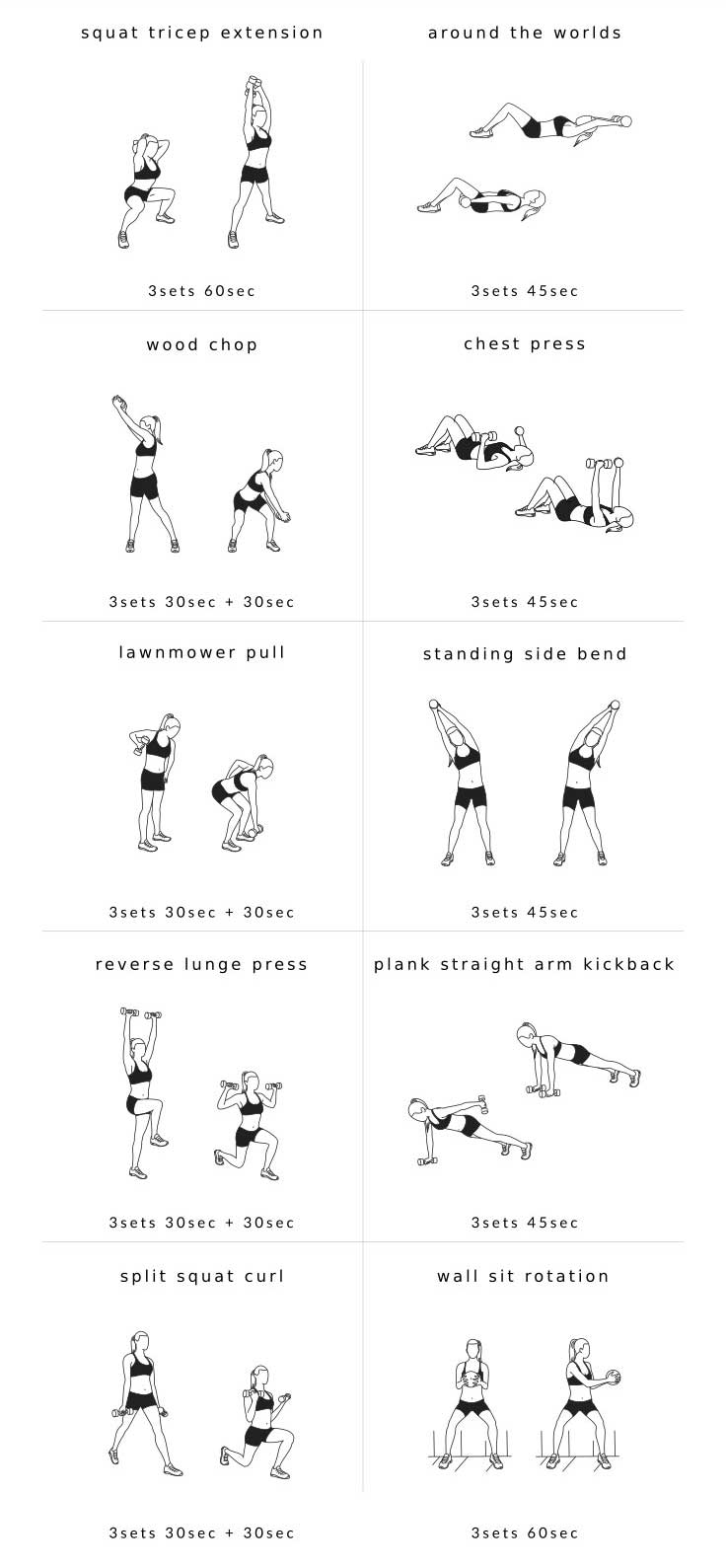 ۹) اسکوآت با پاهای باز: ۳۰ ثانیه + ۳۰ ثانیه. یک پا را در عقب و پای دیگر را در جلو بگذارید. زانوها را خم کنید و کپلها را پایین بیاورید. عضلات دوسر را منقبض کرده و در همین حین، دمبلها را تا ارتفاع شانه خود بالا بیاورید. سپس، دستها را در حین اینکه به حالت ایستاده در میآیید، پایین بیاورید. حرکت را برای ۳۰ ثانیه انجام داده و سپس جای پاها را با هم عوض کرده و مجدداً به انجام حرکات بپردازید.