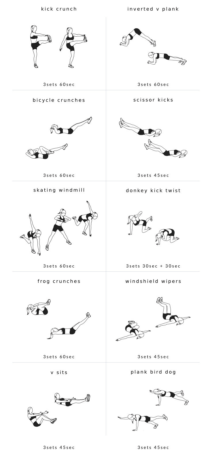 ۹) دراز و نشست به شکل V انگلیسی: ۴۵ ثانیه. پاهای خود را با زاویه ۴۵ درجه بلند کنید و دستها و شانهها را در بالای زمین نگه دارید. بالاتنه را صاف نگه دارید و زانوها را خم کنید. سپس، پاها را صاف کرده و بالاتنه را به آرامی، پایین آورده و بر روی زمین قرار بدهید.