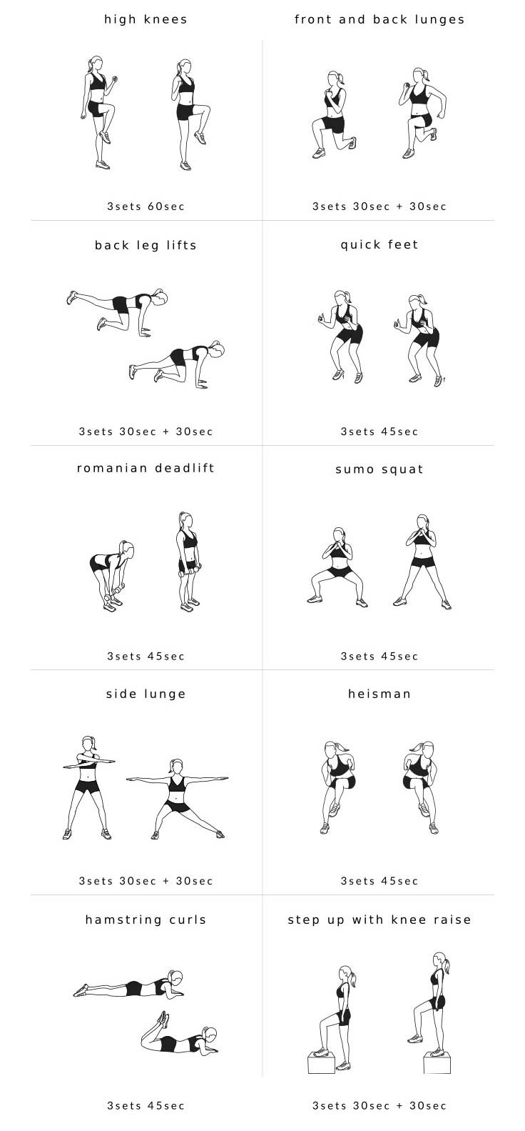 ۹) کرل عضلات پشت ران: ۴۵ ثانیه. بر روی شکم خود دراز کشیده و پاها را کاملاً دراز کنید. سینه را بالا داده و دستها را در زیر سینه قرار بدهید. سپس، زانوها را خم کرده و پاها را به سمت بالا بکشید و عضلات باسن را منقبض کنید.