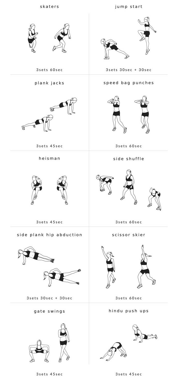 ۱) اسکیتباز: ۶۰ ثانیه. به جلو خم شده و باسن را به عقب بدهید. به سمت راست بپرید و پای چپ را در پشت و دست چپ را در جلوی بدن قرار بدهید. سپس، به سمت چپ بپرید و دست راست را در جلو و پای راست را در عقب بگذارید. حرکت را به مدت ۶۰ ثانیه تکرار کنید.