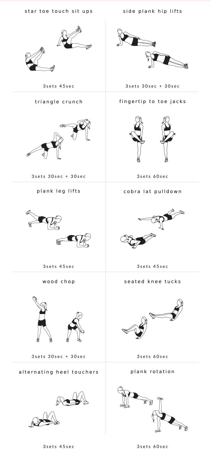 ۱) دراز و نشست ستاره همراه با لمس انگشتان پا: ۴۵ ثانیه. به پشت بر روی زمین دراز بکشید. پای راست و بالاتنه خود را به طور همزمان بلند کرده و دست چپ را به مچ پای راست برسانید. به روی مت برگشته و حرکت را برای سمت مخالف بدن، تکرار کنید.