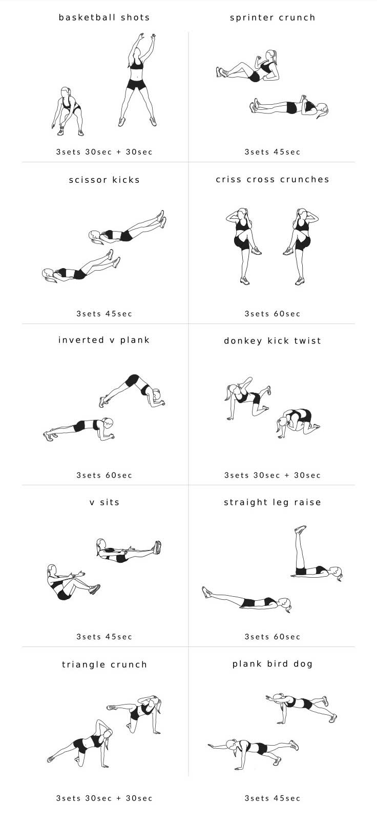 ۱) پرتاب بسکتبال: ۳۰ ثانیه + ۳۰ ثانیه. بایستید و پاها را به اندازه عرض شانه باز کنید. زانوها را خم کنید و کپلها را به عقب فشار بدهید. هر دو دست را در نزدیکی مچ پای راست نگه داشته و سپس، به بالا بپرید و دستها را در بالای سر در سمت چپ، دراز کنید. حرکت را به مدت ۳۰ ثانیه انجام داده و سپس برای سمت دیگر بدن تکرار کنید.