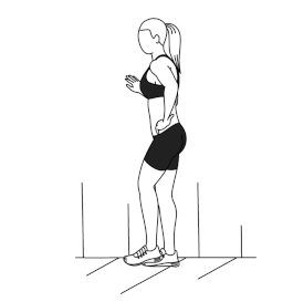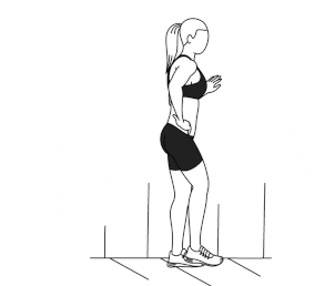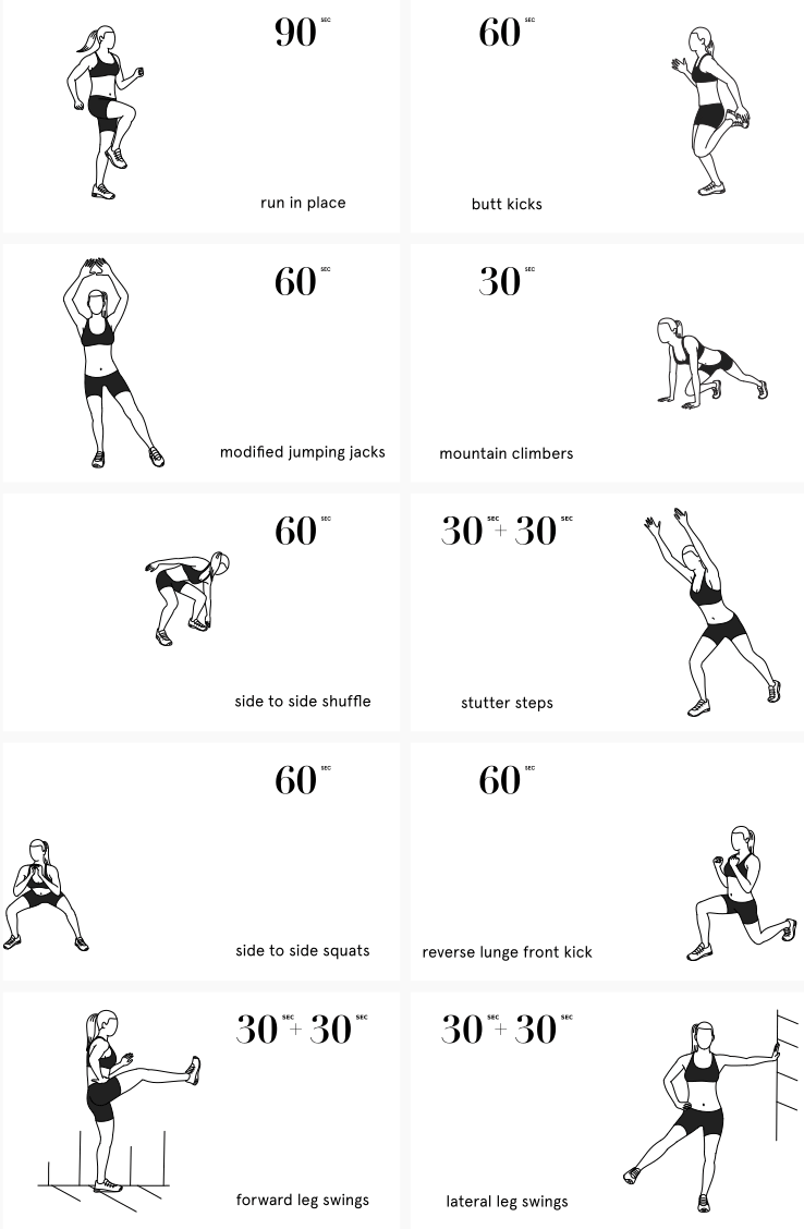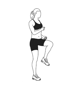 ۱) درجا دویدن: ۹۰ ثانیه. صاف بایستید. سینه را به جلو بدهید و زانوها را به بالا بکشید و به آرامی بر روی پنجه پاهای خود فرود بیایید.
