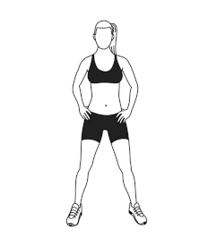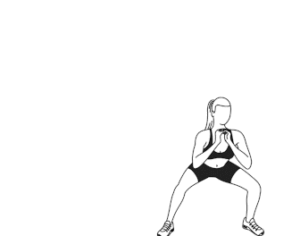 ۷) اسکوآت طرفین: ۶۰ ثانیه. در حالت اسکوآت قرار بگیرید. در حین بلند شدن، یک قدم کوچک به یک طرف برداشته و مجدداً به حالت اسکوآت برگردید. حرکت اسکوآت به طرفین را انقدر تکرار کنید تا ۶۰ ثانیه سپری شود.
