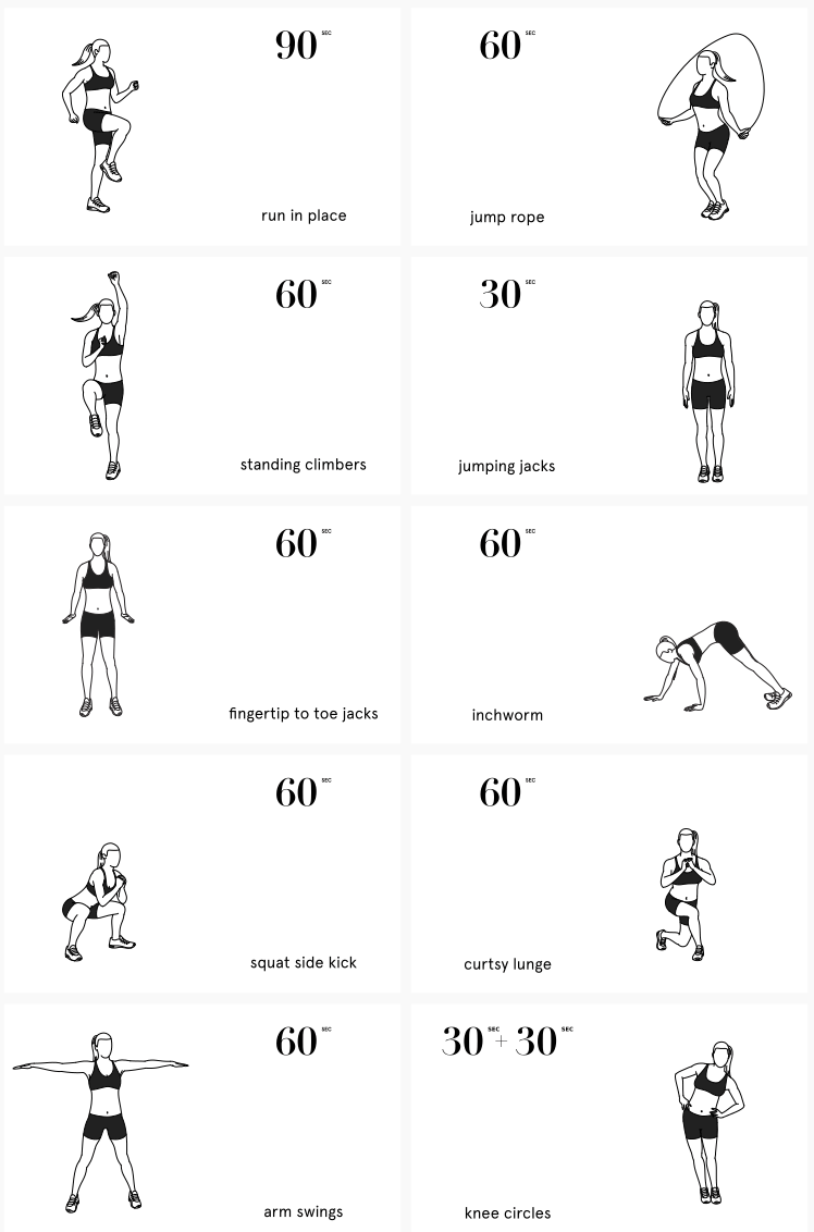 ۱) درجا دویدن: ۹۰ ثانیه. ورزشهای گرمکننده را با درجا دویدن شروع کنید تا ضربان قلب شما افزایش پیدا کند.