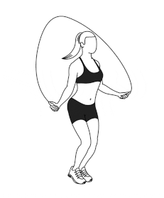 ۲) طناب زدن: ۶۰ ثانیه. زانوها را کمی خم کرده و به بالا بپرید و بر روی پنجه پا فرود بیایید.
