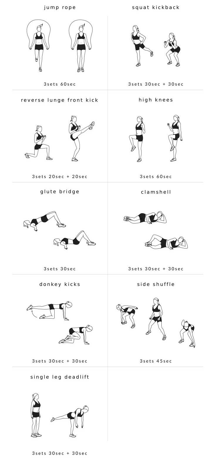 ۲) اسکوآت و لگد به عقب: ۳۰ ثانیه + ۳۰ ثانیه. در موقعیت اسکوآت قرار بگیرید. سپس، در حین اینکه در حال ایستادن هستید، وزن خود را بر یک طرف انداخته و با پای مخالف، به عقب لگد بزنید. حرکت را به مدت ۳۰ ثانیه انجام داده و سپس، برای سمت دیگر تکرار کنید.