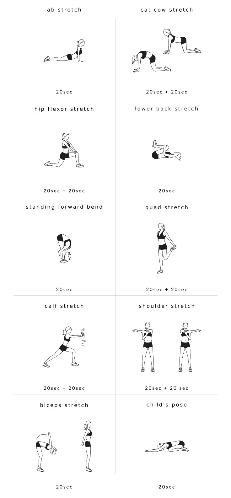 ابتدا به مدت ۱۰ دقیقه، بدن خود را گرم نموده و سپس، ورزشهای مخصوص کل بدن را انجام بدهید و بعد با انجام مجموعه ورزشهای سردکننده که در زیر به شرح آنها میپردازیم، ورزش را به اتمام برسانید.