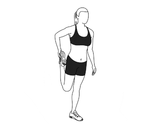 ۶) کشش عضله چهارسر: ۲۰ ثانیه + ۲۰ ثانیه. رانها را در کنار یکدیگر نگه داشته و یک پا را با دست خود بگیرید و به سمت باسن خود بکشید. مدتی در این حالت کشش، باقی مانده و بعد، حرکت را برای سمت دیگر بدن، تکرار کنید.